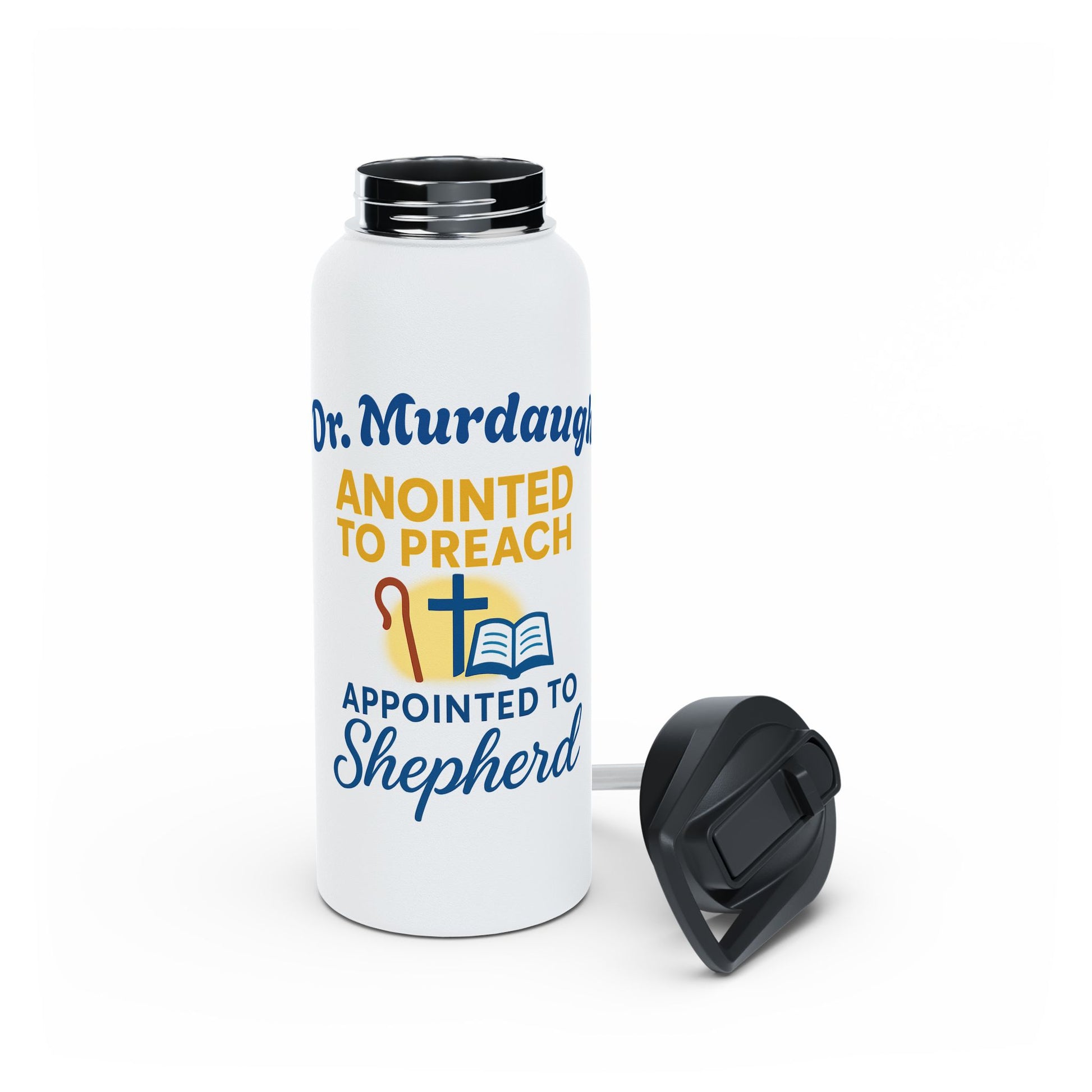 This stainless steel water bottle blends everyday practicality with quiet, faith-driven pride. The matte, grainy finish holds bright, long-lasting prints that speak clearly: a shepherd’s staff, an open Bible, and bold lettering that celebrates pastoral calling. Double-wall insulation keeps coffee warm through early morning study or chills your water during outdoor church retreats. The twist-on polypropylene lid is secure and BPA-free, so it travels safely from pulpit to parking lot. Choose from three sizes to match commute, sermon prep, or longer days away from home.
